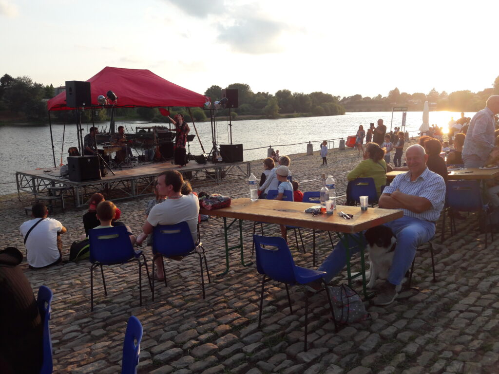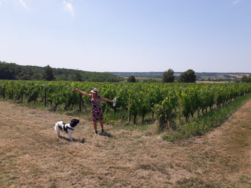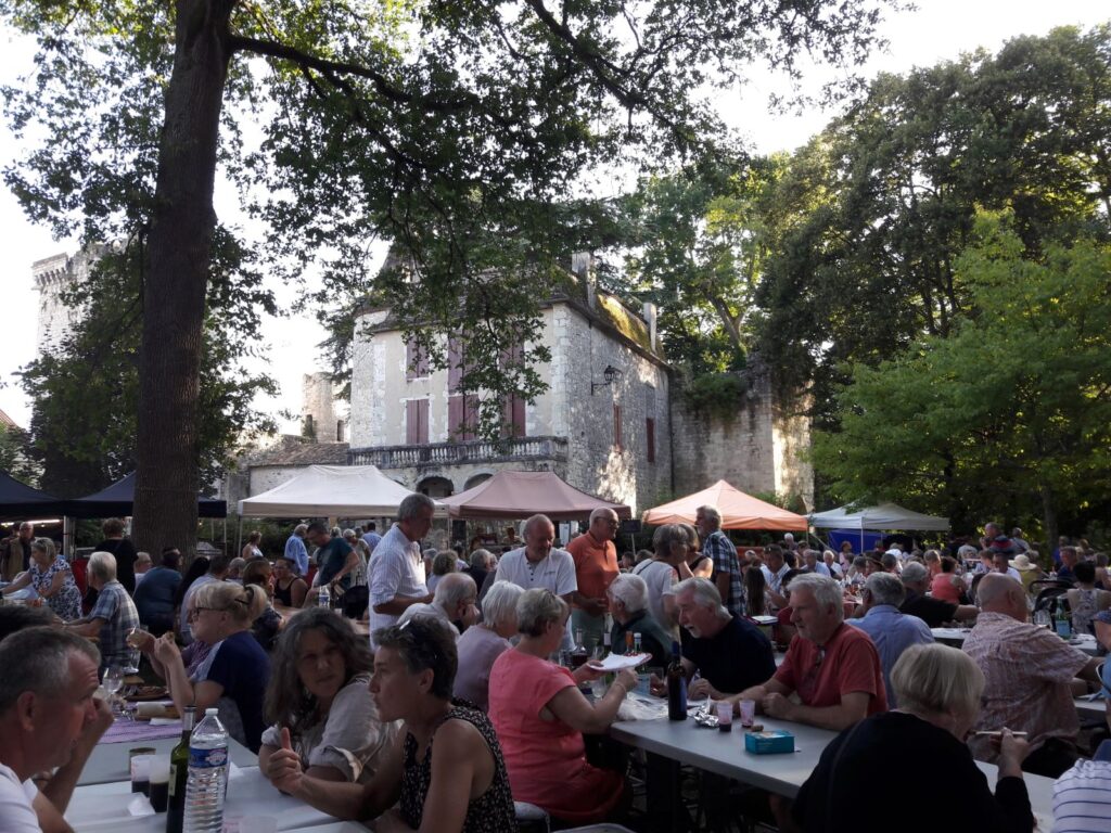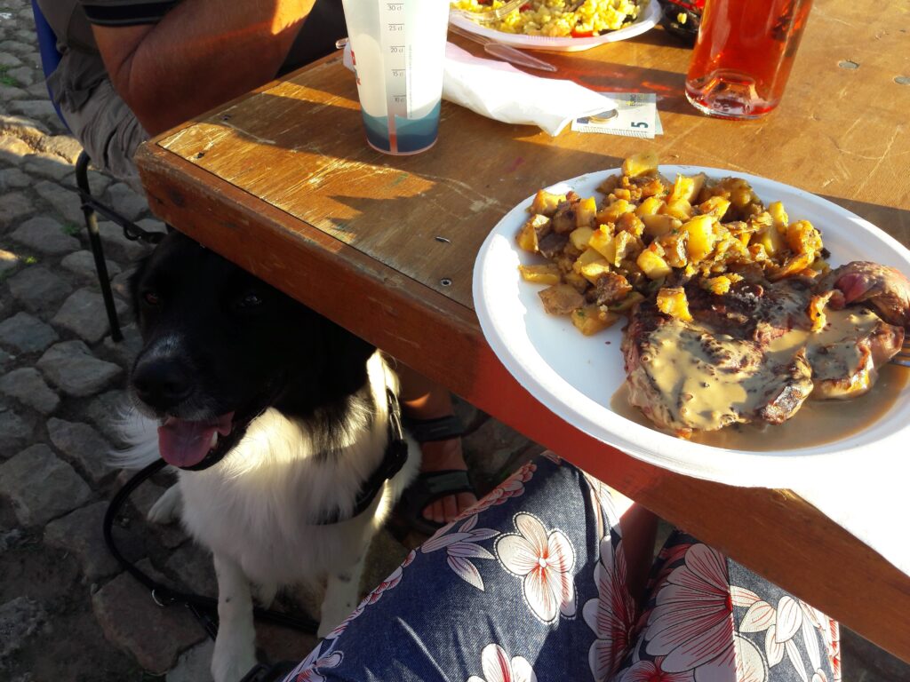 Hier in de Dordogne is de vakantie echt begonnen. Er zijn heel veel toeristen, Engelsen, Nederlanders, Belgen, maar 70% van de vakantiegangers zijn gewoon de Franzosen. Alle dorpjes hier in de omgeving springen hier op in. Markten, soirée gourmandes (waar je zelf je bordje en glas mee moet nemen), brocantes, vlooienmarkten, feestavonden, je kan het zo gek niet noemen. Reuzegezellig allemaal. Mijn baasjes vinden dit allemaal heel leuk en bezoeken zo’n 2-3 keer per week een marktje of gaan ’s avonds naar de .. gourmande. Zo waren ze afgelopen maandag in Bergerac. Aan de oever van de Dordogne, in de haven, hadden ze podium gemaakt en stonden er eetkraampjes en lange tafels om in zomerse stemming naar Franse volksliedjes te luisteren. Flesje wijn erbij, paella of een entrecote, het leven kan toch prachtig zijn hier met die mooie zomerse avonden. En ik vind het allemaal super leuk hoor, krijg heel veel aandacht en er schiet altijd wel wat over voor mij.