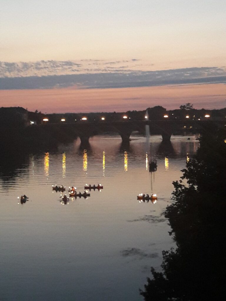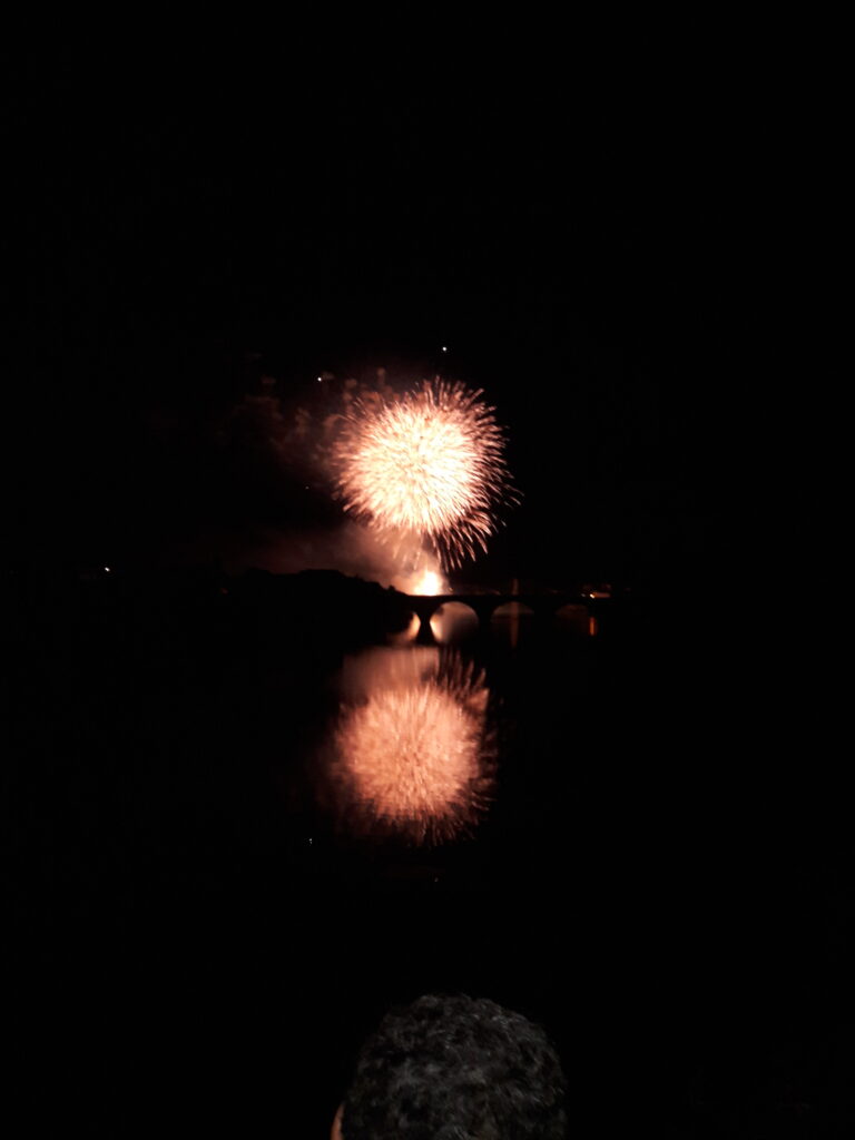 Gisteren was het hier quatorze juilliet, we naar de vlooienmarkt in Thenac geweest (wat een ouwe zooi zeg) en ’s avonds was er eten en muziek in het lokale park. Mijn baasjes zijn daarna nog vuurwerk wezen kijken in Bergerac (ik mocht niet mee, ik heb het niet zo op die knallen); wat ik gehoord heb was het vuurwerk harstikke mooi boven de rivier. De baasjes stonden op een brug en hadden mooi uitzicht op het vuurwerk.