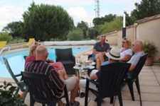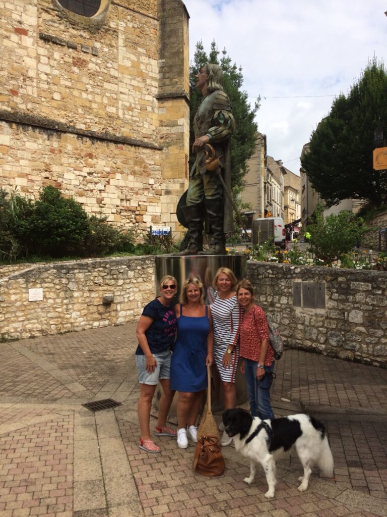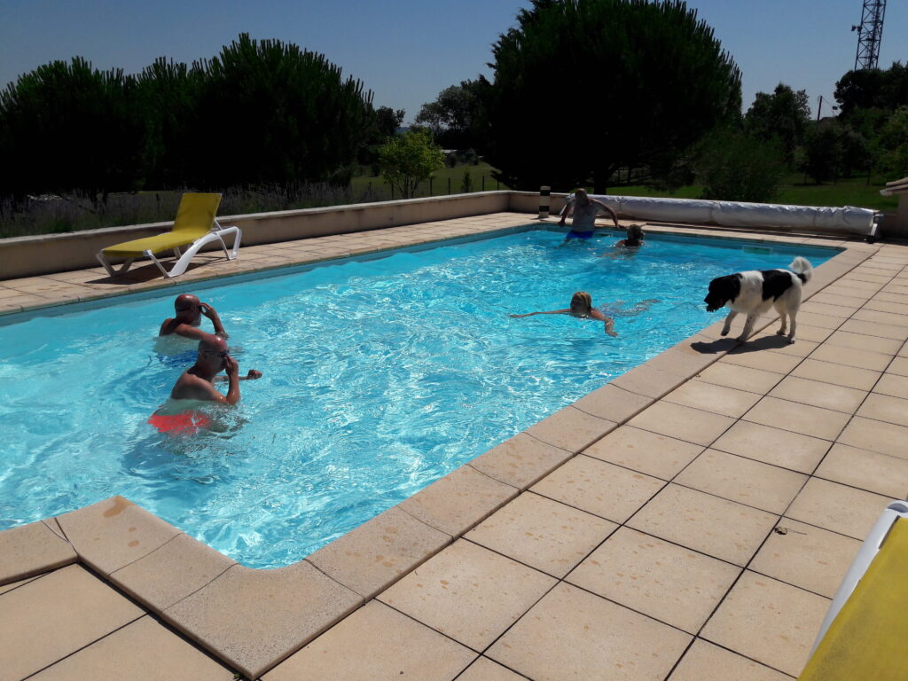 Nou ze maken zich geen zorgen hoor. Het was reuze gezellig en ik kreeg alle aandacht die ik maar wilde. Zeker Karina en Anne Marie vertroetelde mij enorm. Ik mocht allemaal dingen die ik normaal nooit mag doen. Kunnen ze niet altijd hier zijn. De bazin had een vol programma gemaakt voor de gasten, de dames een bezoekje aan Bergerac, de mannen een rondje golfen met de baas. Op zaterdag een toeristisch rondje in de buurt ( sur Dropt, sur Drop, lunch in Duras en la Fête in Monteton). Daarna gingen de mannen voetbal (Engeland – Zweden) kijken in de pub in het dorp en de dames lagen lekker bij het zwembad. ’s Avonds heerlijk uit eten bij de familie Moutier (http://www.famillemoutier.com/ ), die een Table d’hôtes hier even verder op hebben. 6 gangen met bij iedere gang een ander wijntje. Ze hebben hun buik helemaal rond gegeten (en voor mij bleef er zo nu en dan ook wat over, hmmm). Op zondag nog even naar de markt in Issigeac (een van de beroemdste markten van Frankrijk, nog even een duik in het zwembad voordat ze weer naar huis vlogen. Het weekend vloog voorbij en het was wel weer stil daarna hoor, ik moest wel weer even wennen zonder al die aandacht.