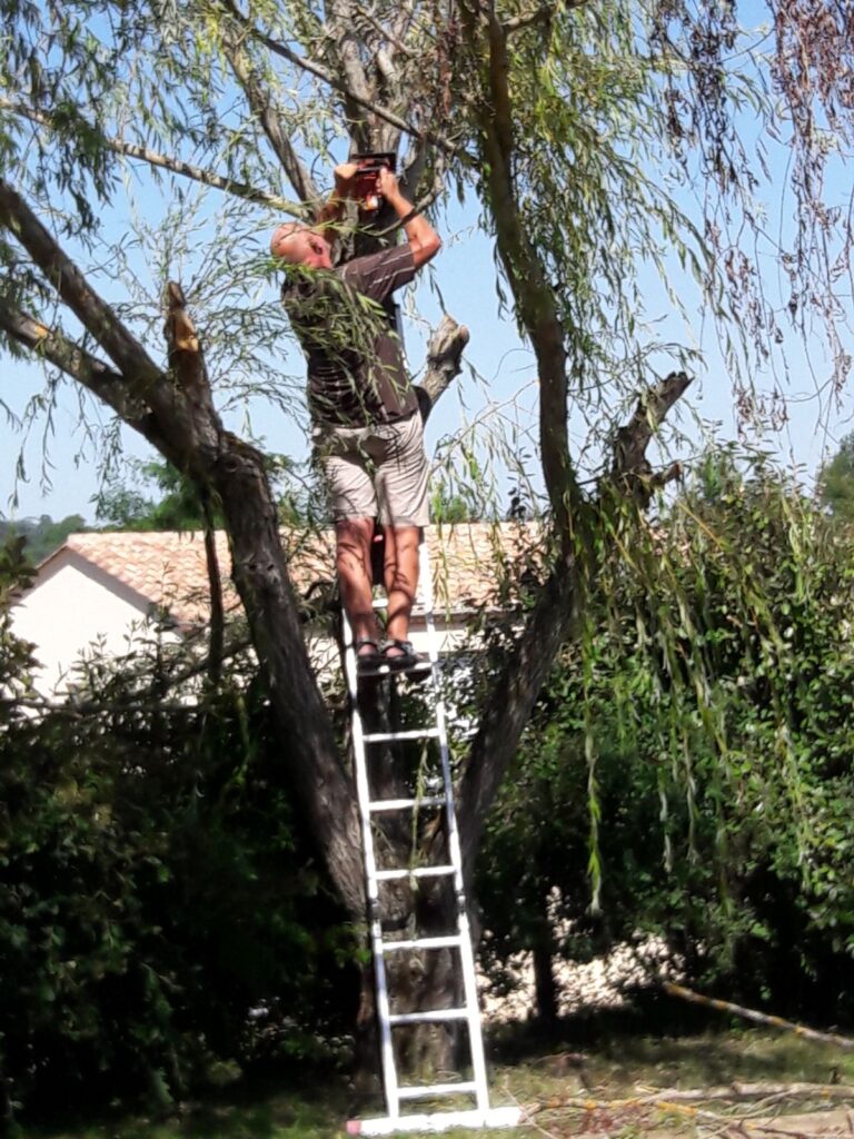 Deze week heeft de grote baas capriolen uitgehaald waarvan ik hoop dat hij dit nooit meer doet. Er staat hier een wilg welke een aantal dode takken heeft. Kennelijk is dit een of andere wilgenziekte en je moet de dooie takken afzagen om te zorgen dat de gezonden takken niet aangetast worden. De baas had een motorzaag van de buurman gekregen en heeft als boomchirurg allerlei halsbrekende toeren uitgehaald om de dooie takken eruit te zagen.