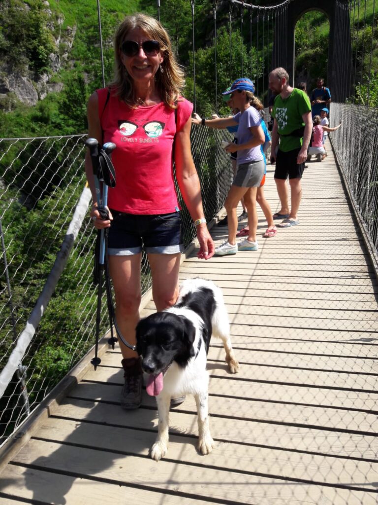 Vorig weekend zijn we er op uit geweest. Lang weekend Pyreneeën. We begonnen in Pau, wat een leuke, mooie stad is dat zeg en we hebben overnacht in een Chambre d’hôte aan de voet van de Pyreneeën. Op zaterdag zijn we de la Vallée d’Aspe (ken je wel van de Tour de France) afgereden, bergedorpjes bezocht, wandeling gemaakt en prachtige uitzichten. Het was een zeer warm weekend in Zuid Frankrijk en gelukkig iets koeler wat hogerop. De zondag heb ik met de bazin nog een lange wandeling gemaakt (de grote baas had last van zijn klusknie en is toch al niet zo’n berggeit). Prachtig langs beekjes en we kwamen uit bij een grote hangbrug, zo’n 180 meter boven het ravijn. Best wel hoog hoor.