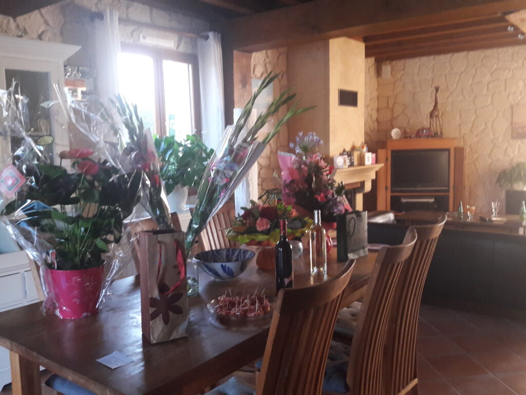 Afgelopen vrijdagavond was het een drukte van belang. De hele buurt op bezoek om kennis te maken onder het genot van een drankje en een hapje. Hierboven in onze straat staan zo’n 10 huizen en bijna alle buren waren gekomen. En ze brachten van alles mee. Prachtige bloemen en mooie flessen wijn. De baasjes waren helemaal overdonderd. Kennelijk wordt er hier in de buurt niet zo veel georganiseerd en de buren vonden het harstikke leuk om eens bij elkaar te komen. Ik zal jullie even kennis laten maken met onze buren. De buurman (Francis) naast ons heeft ons huis ontworpen (eind jaren 90). Samen met zijn vrouw Elyan wonen ze hier nu ruim 2 jaar en hebben een prachtig huis gebouwd. Het zijn heel lieve aardige mensen en ik krijg altijd een aai van ze. De andere buren wonen hier al heel lang. De baasjes zijn vorige week op kennismakingsbezoek geweest, ik mocht niet mee omdat ik de hond van de buren niet zo aardig vind. De buurvrouw woont hier sinds haar jeugd en de familie heeft een conservenfabriek hier in het dorp. Achter ons woont een homostel met hun hondje Lola. De een is Engels en de andere is hier geboren. Ze hadden een succesvolle kapperszaak in Londen, maar het werd hen daar veel te druk. Nu zijn ze hier in het dorp een kapperszaak begonnen in de hoop dat het wat rustiger zou worden. Maar de klanten uit Londen komen nu hier heen en nu hebben ze het nog steeds zo druk. Maar het zijn heel aardige vrolijke mensen. Verder wonen hier nog 2 gepensioneerde politieagenten, een politie agent in actieve dienst (met zoveel politie voel je je niet onveilig), een dokter uit Hamburg met zijn vrouw uit Maleisië en nog een paar anderen die we nog niet zo goed kennen. Maar we zijn dus al aardig ingeburgerd.
