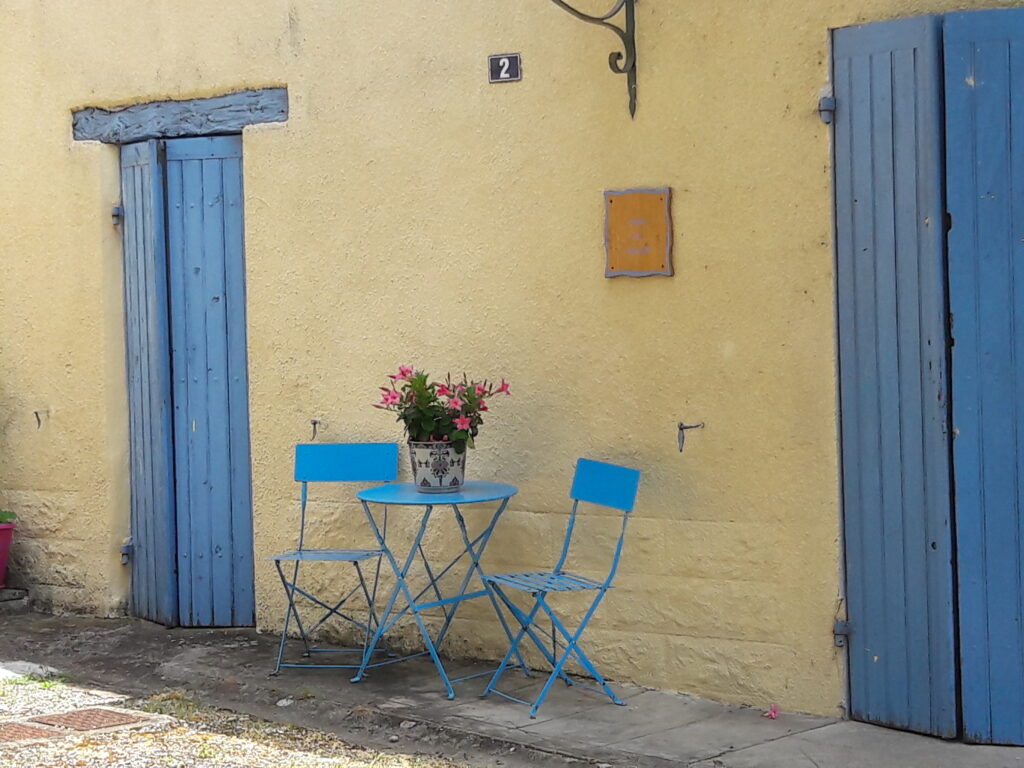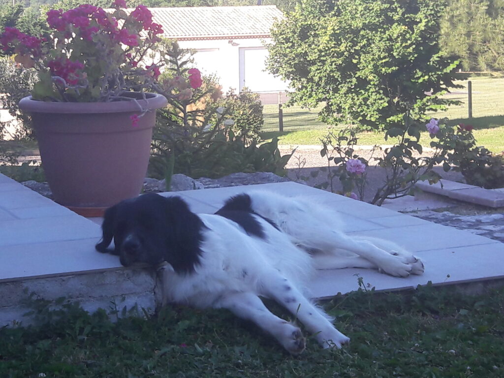 De baasjes zijn inmiddels een beetje tot rust gekomen. Man, man wat hebben ze het druk gehad. Dozen uitpakken, kasten in elkaar zetten, witten, gras maaien, tuin omspitten voor zomerbloemetjes, de bloembakken vullen om het allemaal wat fleuriger te maken rond het huis. De bazin heeft inmiddels haar werkplekje gevonden en is harstikke druk met werk. Maar aan het einde van de dag een duik in het zwembad, een mooi fietstocht door de omgeving of lekker uit eten in een van de dorpjes in de buurt. Donderdag waren we in Monteton, een prachtig plaatsje op een heuvel waar ze op een idyllisch plekje heerlijk gegeten hebben. En ik lag lekker lui onder de boom… Zie je wel, ik integreer al harstikke goed.